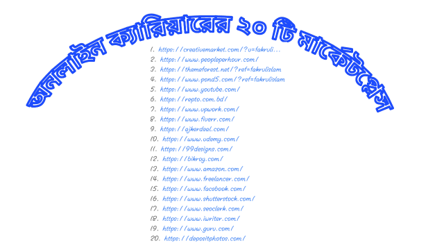 আমরা অনেকেই আছি যারা অনলাইনে একটি হ্যান্ডসাম ক্যারিয়ার বিল্ড করতে চাই। যারা এটা নিয়ে স্বপ্ন দেখেন তাদের জন্য এই ২০ টি সাইট। যেটা আপনি ভাল পারেন বা যেটা তে আপনি কাজ করতে চান সেই কাজ রিলেটেড একটি সাইট চুজ করে কাজে লেগে যান। শুভকামনা রইলো আপনার জন্য।
