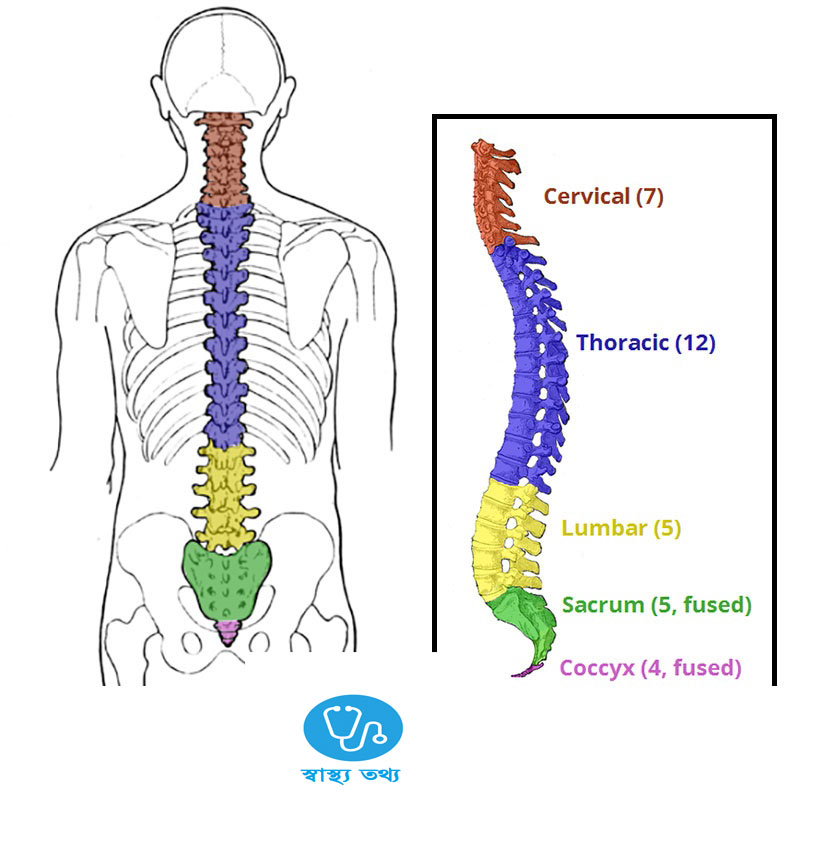 আমাদের মেরুদন্ড ৩৩ টি হাড় দ্বারা গঠিত এর মধ্যে ঘার এর ৭টি, পিঠে ১২ টি, কোমরে ৫ টি হাড় এর মাঝে ২৩টি ইন্টার ভারটিব্রাল ডিস্ক থাকে। স্যাক্রাম ৫টি ও কক্সিস ৪টি করে ভারটিব্রা এর সমস্টি। এদের মাঝে কোন ডিস্ক থাকেনা।