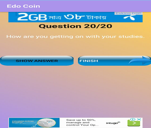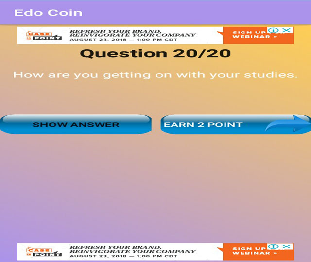 ৭। এখানে আপনি NEXT QUESTION বাটনে EARN 2 POINT লেখা দেখতে পাবেন সেখানে ক্লিক করবেন। ক্লিক করার পর যে অ্যাড আসবে সেই অ্যাডে ক্লিক করবেন সেখানে আপনাকে ৫০ সেকেন্ড অপেক্ষা করতে হবে। অপেক্ষা করার পর আবার অ্যাড আসবে সেই অ্যাডটি কেটে দিবেন। আপনার কাজ শেষ। এবার নিচের মতো একটি ইন্টারফেস দেখতে পাবেন।