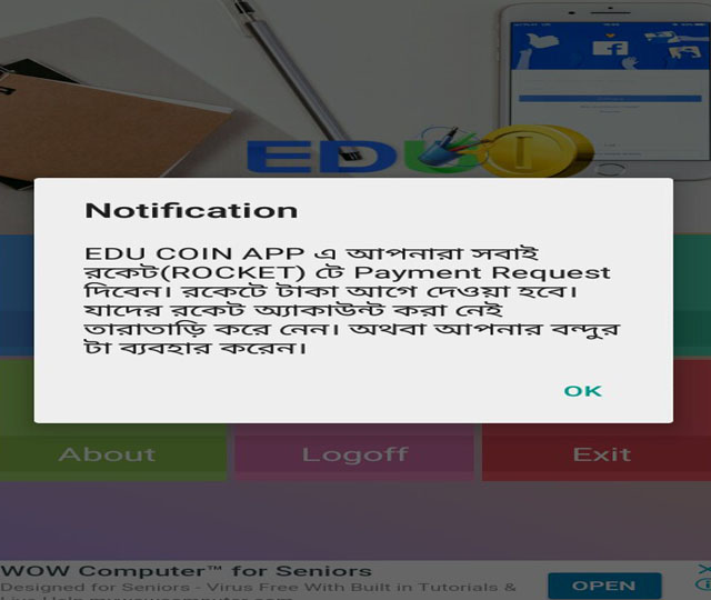 ৪। লগইন করার পর উপরের মতো একটি ছবি দেখতে পাবেন। সেখানে বলা হয়েছে। EDU COIN app এ আপনারা সাবাই রকেটে পেমেন্ট রিকোয়েস্ট দিবেন। রকেটে টাকা আগে দেওয়া হবে। আর যাদের রকেটে অ্যাকাউন্ট নেই তাদেরকে করে নিতে বলেছে। তাই আপনার যদি রকেটে অ্যাকাউন্ট না থাকে তাহলে একটি রকেটে অ্যাকাউন্ট করে নিবেন। এরপর ok বাটনে ক্লিক করুন।