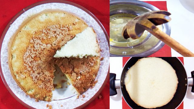 ডালঘুটনি দিয়ে ডিম ফেটিয়ে ফোম করে ফ্রাইপ্যানে ৪টি উপকরনে চুলায় ভেনিলা কেক তৈরি করুন.