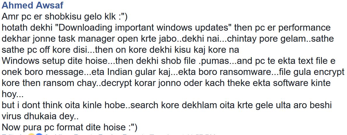 আমাদের দেশের কিছু লোকের কম্পিউটার এই ভাইরাসে আক্রান্ত, চলুন তাদের কমেট গুলো দেখি,