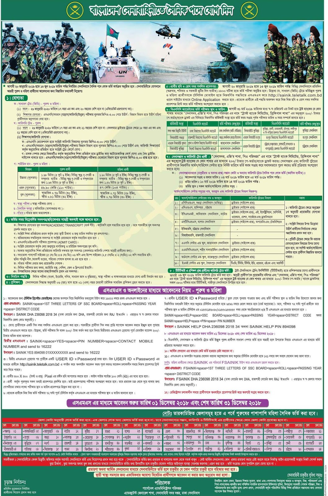 আবারো 16222 তে পাঠাতে হবে। এরপর এস এম এস এর মাধ্যমে ইউজার আইডি ও পাসওয়ার্ড দেয়া হবে। সেই ইউজার আইডি ও পাসওয়ার্ড দিয়ে এই লিংকে http://sainik.teletalk.com.bd/ প্রয়োজনীয় তথ্য দিয়ে আবেদন করতে হবে। আবেদন করতে এখানে ক্লিক করুন। নিচে বাংলাদেশ আর্মিতে সৈনিক নিয়োগ বিজ্ঞপ্তি 2018 ভালভাবে দেখে নিন। আরও তথ্য পেতে ভিজিট করুন https://allcircularbd24.blogspot.com/