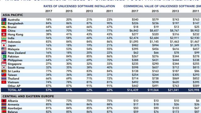 বিশ্বে নকল (পাইরেটেড) সফটওয়্যার ব্যবহারের দিক থেকে বাংলাদেশের অবস্থান পঞ্চম। সম্প্রতি সফটওয়্যার উৎপাদনকারী প্রতিষ্ঠানগুলোর আন্তর্জাতিক সংগঠন 'বিজনেস সফটওয়্যার অ্যালায়েন্সে (বিএসএ)' প্রকাশিত গবেষণা প্রতিবেদন থেকে এই তথ্য জানা যায়। সংগঠনটি ‘সফটওয়্যার ম্যানেজমেন্ট: সিকিউরিটি ইম্পারেটিভ, বিজনেস অপরচুনিটি’ শীর্ষক এক প্রতিবেদনে বিশ্বে নকল সফটওয়্যার ব্যবহারের সার্বিক তথ্য তুলে ধরেছে। ২০১৮ সালে প্রকাশিত এই জরিপে ২০১৭ সাল পর্যন্ত তথ্য সন্নিবেশিত করা হয়। প্রতিবেদনে দেখা যায়, ২০১৭ সালে ৮৪ শতাংশ নকল সফটওয়্যার ব্যবহার করে পাইরেটেড সফটওয়্যার ব্যবহারকারী দেশগুলোর তালিকায় পঞ্চম স্থানে আছে বাংলাদেশ। এক্ষেত্রে এশিয়া প্যাসিফিক অঞ্চলে বাংলাদেশের অবস্থান শীর্ষে। অন্যদিকে সব দেশ মিলিয়ে সফটওয়্যার ব্যবহারে শীর্ষস্থানে আছে লিবিয়া। দেশটিতে ৯৫ শতাংশ পাইরেটেড সফটওয়্যার ব্যবহৃত হয়। তালিকায় যৌথভাবে দ্বিতীয় অবস্থানে আছে ভেনেজুয়েলা ও জিম্বাবুয়ে। দেশ দুটির নকল সফটওয়্যার ব্যবহারের হার ৮৯ শতাংশ। এছাড়া তৃতীয় অবস্থানে আছে ইয়েমেন (৮৮ শতাংশ) এবং যৌথভাবে চতুর্থ অবস্থানে আছে ইরাক ও আর্মেনিয়া (৮৫ শতাংশ)। প্রকাশিত প্রতিবেদনের তথ্য বলছে, বাংলাদেশে পাইরেটেড বা নকল সফটওয়্যার ব্যবহারের পরিমাণ আগের চেয়ে কমেছে। ২০১৭ সালে ৮৪ শতাংশ ব্যবহার হলেও ২০১৫ সালে এই হার ছিল ৮৬ শতাংশ। এছাড়া ২০১৩ সালে ৮৭ এবং ২০১১ সালে নকল সফটওয়্যার ব্যবহারের হার ছিল ৯০ শতাংশ। প্রসঙ্গত, প্রতি দুই বছর পর পর এ ধরনের গবেষণা প্রতিবেদন প্রকাশ করে বিএসএ। এতে সফটওয়্যার ব্যবহারের সর্বশেষ অবস্থা তুলে ধরা হয়।