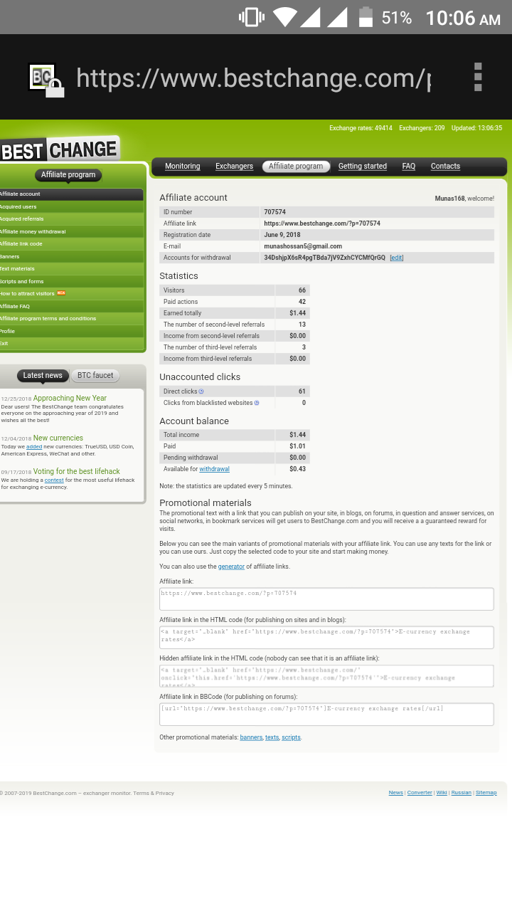 দেখুন আমার ৬৬ ভিজিটর বা ৪২ টা পেইড ক্লিকে ১.৪৪$ ইনকাম হয়েছে। এখানে আপনি প্রতি ক্লিকে ০.০৪$ বা ৪ টাকা করে পাবেন। এখানে আপনি মাত্র ১$ হলেই টাকা উইথড্র করতে পারবেন।