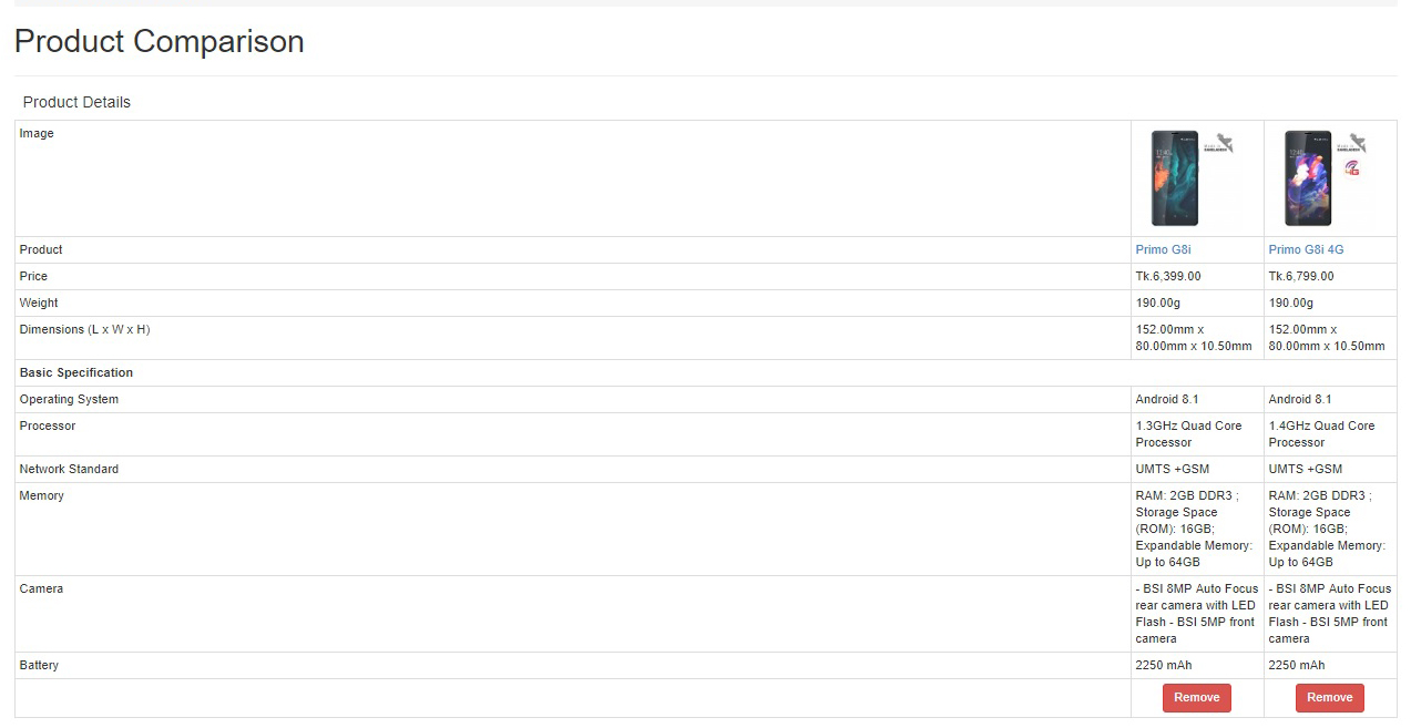 প্রিমো জি৮আই ৪জি কে প্রিমো জি৮আই এর সাথে তুলনা করতে হলে, কেবল একটি বিষয়ই উঠে আসবে আর তা হল এর প্রসেসর, কানেকটিভিটি এবং দাম। প্রসেসর এর দিক দিয়ে এই দুটি ডিভাইস সামান্য আলাদা। প্রিমো জি৮আই'তে ছিল ১.৩ গিগাহার্জ কোয়াড কোর প্রসেসর আর এতে পাওয়া যাবে ১.৪ গিগাহার্জ কোয়াড কোর প্রসেসর। আর প্রিমো জি৮আই এর দাম ৬৩৯৯ টাকা আর প্রিমো জি৮আই ৪জি এর দাম ৬৭৯৯ টাকা।