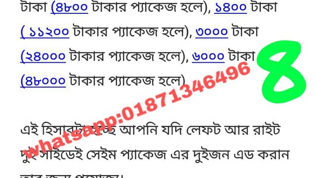 এই অফার-গুলোর মধ্যে যে কোন একটি কিনে আপনি টাকা ইনকাম করা শুরু করতে পারেন। আপনার প্রথমে যদি বিশ্বাস না হয় তাহলে ভাই শুধু ১৬০০ টাকার একটা প্যাকেজ কিনে শুরু করেন। তারপর যদি মনে হয় আমি যা বলছি তা-ই সত্যি তাহলে আপনি ইনভেস্ট করিয়েন আরো।