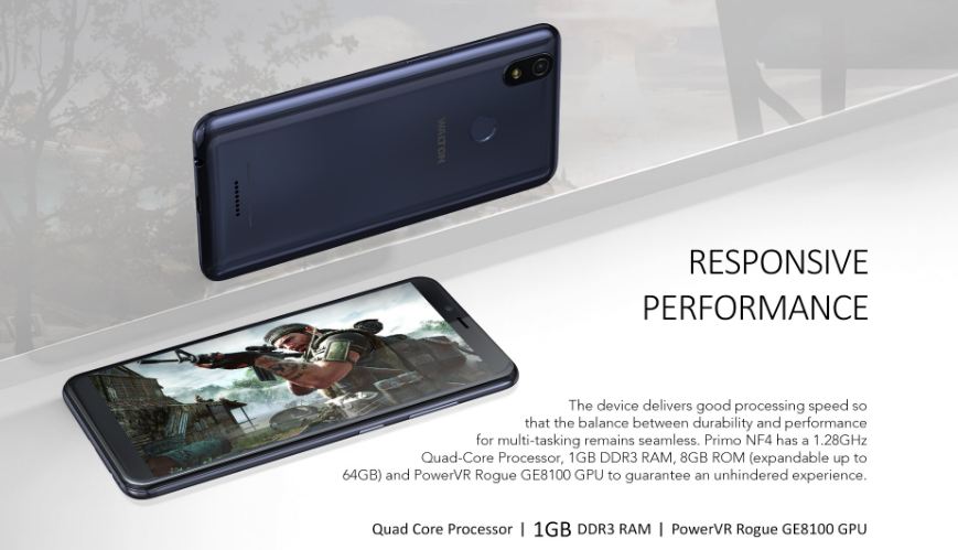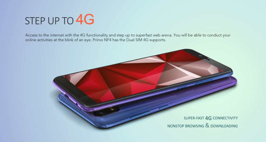 একনজরে প্রিমো এনএফ৪ঃ অ্যান্ড্রয়েড ৮.১ অরিও এর গো এডিশন, ১ জিবি র্যাম এবং ৮ জিবি রম - পাশাপাশি ৬৪ জিবি পর্যন্ত এক্সপান্ডেবল মেমোরি কার্ড সাপোর্ট, ১.২৮ গিগাহার্জ কোয়াড কোর প্রসেসর, ৫.৯৯ ইঞ্চি ফুল ভিউ আইপিএস ডিসপ্লে, উন্নত ৮ মেগাপিক্সেল রিয়ার এবং ৮ মেগাপিক্সেল ফ্রন্ট ক্যামেরা; আর সম্পূর্ণ ডিভাইসকে ব্যাকআপ দেয়ার জন্য ৩২০০ মিলি অ্যাম্পিয়ার ক্ষমতার ব্যাটারি। এর দাম ৬৪৯৯ টাকা।