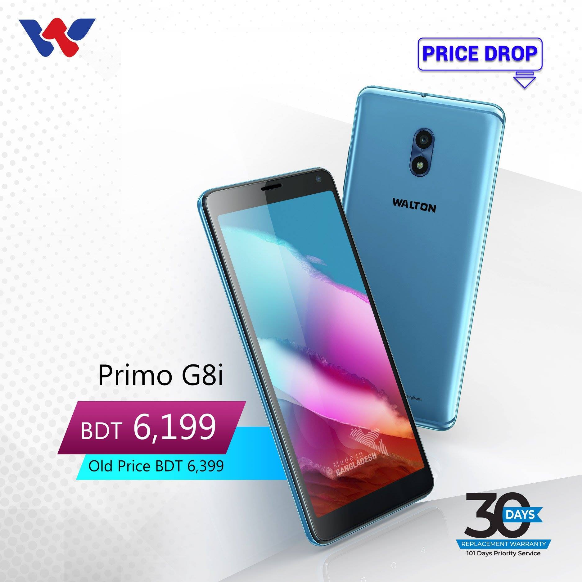 সম্প্রতি দাম কমেছে ওয়ালটন এর প্রিমো জি৮আই স্মার্টফোনের। যেখানে আগে এর দাম ছিল ৬৩৯৯ টাকা। সেখানে এখন এর দাম মাত্র ৬১৯৯ টাকা। প্রিমো জি৮ আই ডিভাইসটি বাজারে পাওয়া যাবে লাইট ব্লু (হালকা নীল) এবং ব্ল্যাক কালারে।