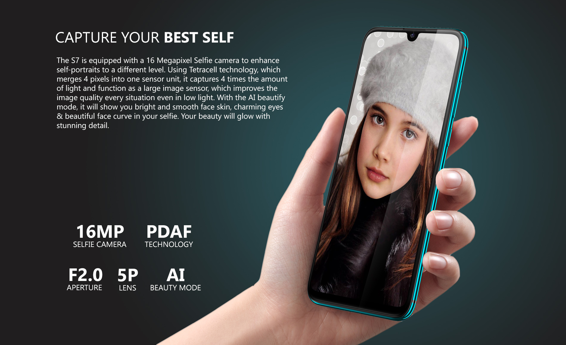 প্রিমো এস৭ স্মার্টফোনটির ফ্রন্ট প্যানেলে ওয়াটার ড্রপ নচ এর ভেতর আছে একটি ১৬ মেগাপিক্সেল এর সেলফি ক্যামেরা সেন্সর। আর এই ক্যামেরাটি আপনার সেলফ পোর্টফলিও তোলাকে অন্য পর্যায়ে নিয়ে যেতে পারে। তাছাড়া এতে থাকবে ফেস ডিটেকশন আটো-ফোকাস এবং আর্টিফিশিয়াল ইন্টেলিজেন্স তথা এআই বিউটি মোড। সেলফি ক্যামেরাটির অ্যাপারচার এফ২.০।