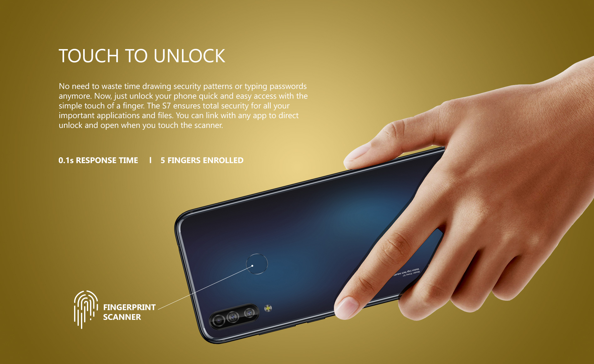 স্মার্টফোনটির রিয়ার প্যানেলে ক্যামেরা মডিউলএর ঠিক কাছেই থাকছে একটি ফিঙ্গারপ্রিন্ট সেন্সর। যেখানে সর্বোচ্চ ৫ টি ফিঙ্গারপ্রিন্ট সাপোর্ট করবে। আর এই ফিঙ্গারপ্রিন্টের রেসপন্স টাইম ০.১ সেকেন্ড; যা সত্যি খুব ফাস্ট।