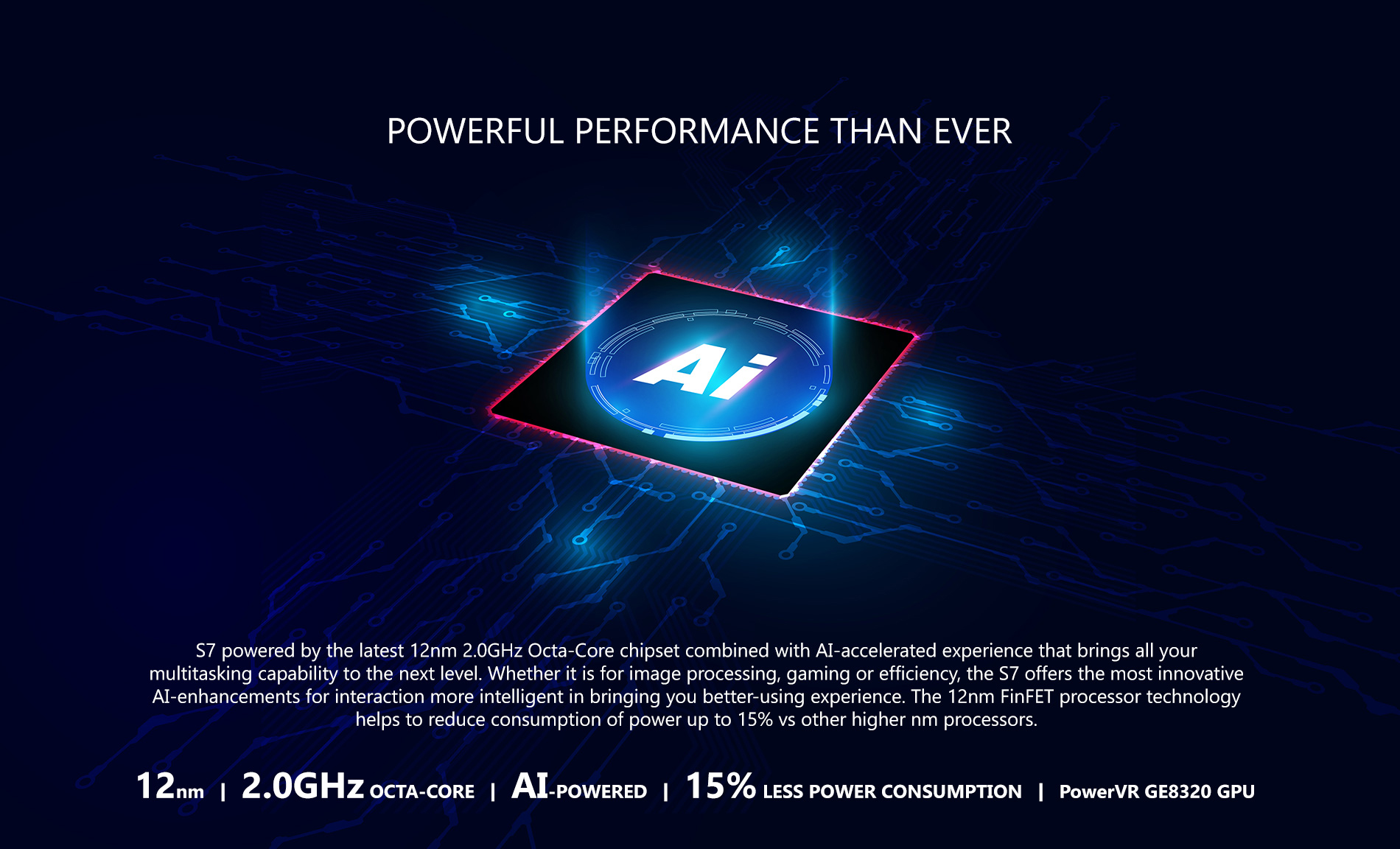 ডিভাইসটির মেইন চিপসেট হিসেবে থাকছে মিডিয়াটেকের mt6762 সিপিইউ। যা একটি ১২ ন্যানোমিটার প্রযুক্তির ২ গিগাহার্জ অক্টা-কোর প্রসেসর। আর এটিও ওয়ালটন এর দাবিতে একটু আর্টিফিশিয়াল ইন্টেলিজেন্স দ্বারা পরিচালিত বলে ইউজার এক্সপেরিএন্স হবে আরও বেশি স্মুথ। আর ১২ ন্যানোমিটার প্রযুক্তি হয়ার কারনে ব্যাটারি এর দিক দিয়েও এটি অনেক সাশ্রয়ী হবে আশা করা যাচ্ছে। এতে থাকবে, পাওয়ার ভিআর জিই৮৩২০ গ্রাফিক্স।
