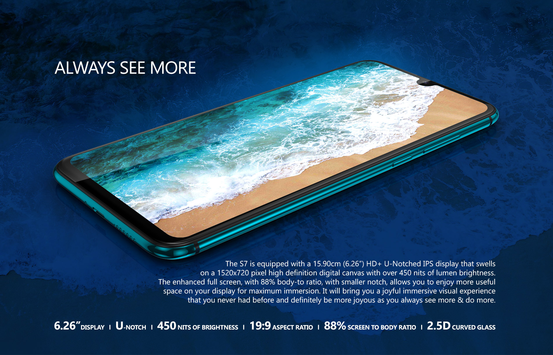 এই প্রিমো এস৭ ডিভাইসটিতে থাকছে ৬ দশমিক ২৬ ইঞ্চির নচ ডিসপ্লে। এটি একদম ১৯ঃ৯ এস্পেক্ট রেসিও আল্ট্রা ফুল ভিউ ডিসপ্লে। যার বডি-টু-স্ক্রিন রেসিও মাত্র ৮৮%। আর এস৭ এর এইচডি+ আইপিএস ডিসপ্লে ব্রাইটনেসএর দিক দিয়ে দারুন, কেননা এর ডিসপ্লে ব্রাইটনেস ৪৫০ নিট।