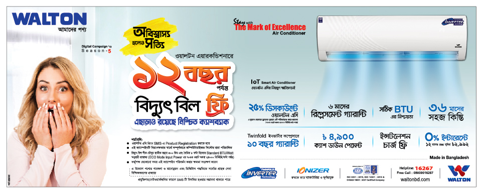 আশ্বিনের শেষ। কিন্তু প্রকৃতি এখনো উষ্ণ। বৃষ্টি হলেও ভ্যাপসা গরম যাচ্ছে না। অস্বস্তিকর এ অবস্থা থেকে স্বস্তি পেতে অনেকেই এয়ার কন্ডিশনার বা এসি কেনার পরিকল্পনা করছেন। কিন্তু বাড়তি বিদ্যুৎ বিলের শঙ্কা তাদের দ্বিধায় ফেলছে। এক্ষেত্রে এসি ক্রেতাদের জন্য দারুণ সুযোগ নিয়ে এসেছে দেশের শীর্ষ ইলেকট্রনিক্স পণ্যের ব্র্যান্ড ওয়ালটন। এখন ওয়ালটন এসিতে রয়েছে ১২ বছর পর্যন্ত বিদ্যুৎ বিল ফ্রি পাওয়ার সুযোগ। এছাড়া ওয়ালটন বাজারে এনেছে ব্যাপক বিদ্যুৎ সাশ্রয়ী এসি।
