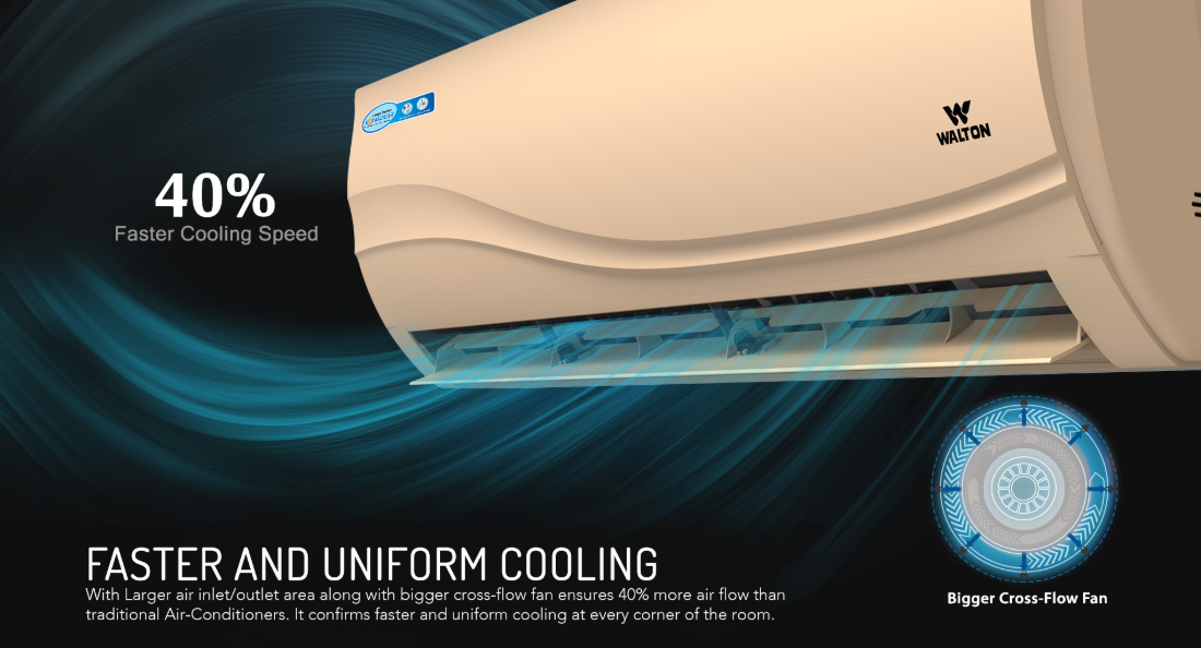 এসিটিতে বড় ক্রস ফ্লো কুলিং ফ্যান ব্যবহার এর কারনে এসিটি পরিবেশ ঠাণ্ডা করতে পারবে আরো দ্রুত। আর রুম তাড়াতাড়ি ঠাণ্ডা হয়ার জন্য এই ফ্যান এর আকার খুবই গুরুত্বপূর্ণ ভুমিকা পালন করে থাকে। আর এই দিক থেকে ভেতরে বড় ফ্লো ফ্যান থাকার কারনে অনেক তাড়াতাড়ি রুমকে আপনার পছন্দের তাপমাত্রায় নিয়ে আসার জন্য ওয়ালটন এসি খুবই দারুন পারফর্মেন্স দিবে।