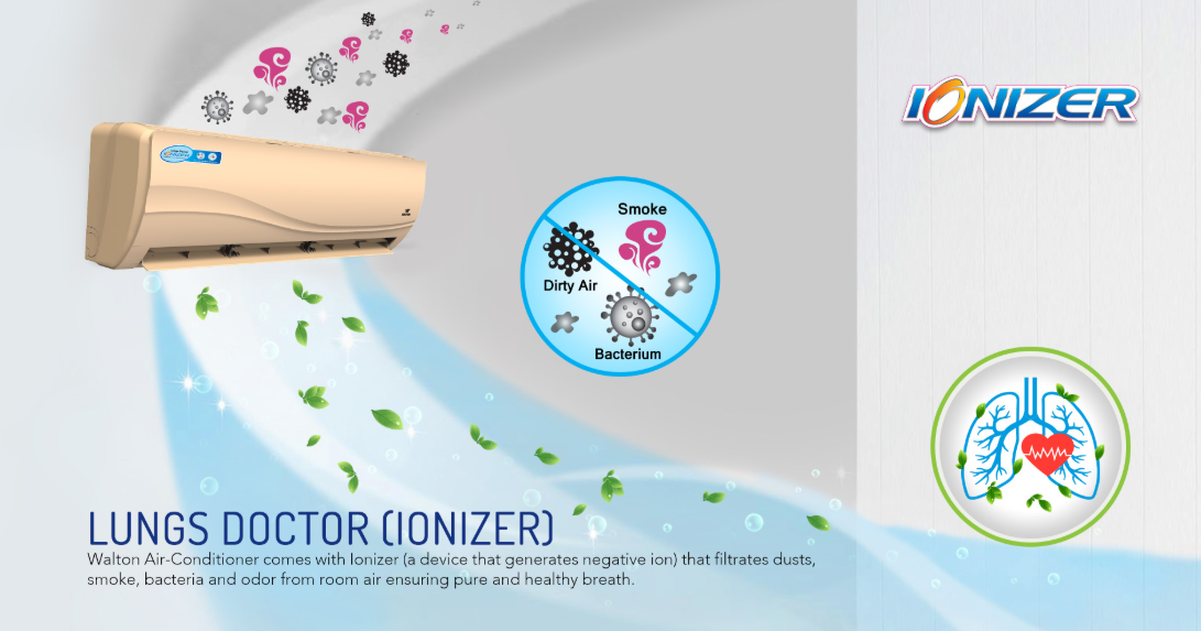 রিভারাইন এসিটি ওয়ালটন আনছে একটি বিশেষ প্রযুক্তির সাথে, যার নাম আইওনাইজার। যার মাধ্যমে এই এসিকে বলা হচ্ছে আপনার ফুসফুসের ডাক্তার। এখানে এসিটি বাতাসে নেগেটিভ আয়ন ত্যাগ করে, যা বাতাসের ভেতর বিদ্যমান অতিক্ষুদ্র ধূলিকণা, ধোয়া, ব্যক্টেরিয়া এসব এসির মাধ্যমে দূর করে। এই নন ইনভার্টার এসিটি কম পরিমানে নয়েস সৃষ্টি করে, যার ফলে রাতে ঘুমানোর সময়েও অনাকাঙ্ক্ষিত যান্ত্রিক শব্দ কানে লাগে না।