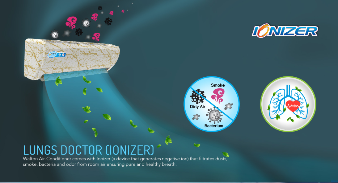 ভেঞ্চুরি এসিটি ওয়ালটন আনছে একটি বিশেষ প্রযুক্তির সাথে, যার নাম আইওনাইজার। যার মাধ্যমে এই এসিকে বলা হচ্ছে আপনার ফুসফুসের ডাক্তার। এখানে এসিটি বাতাসে নেগেটিভ আয়ন ত্যাগ করে, যা বাতাসের ভেতর বিদ্যমান অতিক্ষুদ্র ধূলিকণা, ধোয়া, ব্যক্টেরিয়া এসব এসির মাধ্যমে দূর করে। এই নন ইনভার্টার এসিটি কম পরিমানে নয়েস সৃষ্টি করে, যার ফলে রাতে ঘুমানোর সময়েও অনাকাঙ্ক্ষিত যান্ত্রিক শব্দ কানে লাগে না।