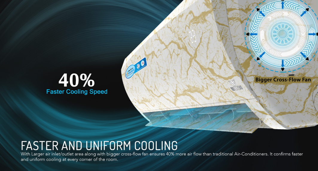 এসিটিতে বড় ক্রস ফ্লো কুলিং ফ্যান ব্যবহার এর কারনে এসিটি পরিবেশ ঠাণ্ডা করতে পারবে আরো দ্রুত। আর রুম তাড়াতাড়ি ঠাণ্ডা হয়ার জন্য এই ফ্যান এর আকার খুবই গুরুত্বপূর্ণ ভুমিকা পালন করে থাকে। আর এই দিক থেকে ভেতরে বড় ফ্লো ফ্যান থাকার কারনে অনেক তাড়াতাড়ি রুমকে আপনার পছন্দের তাপমাত্রায় নিয়ে আসার জন্য ওয়ালটন এসি খুবই দারুন পারফর্মেন্স দিবে।
