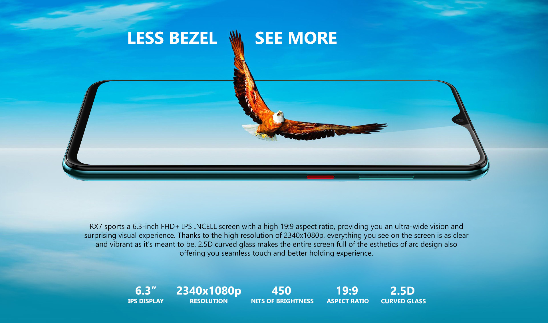 ফোনটিতে ১৯ঃ৯ রেসিও সম্বলিত ডিসপ্লে দেয়া হয়েছে, আর আমরা জানি যে এই রেসিও সম্বলিত ডিসপ্লে গুলোতে সাইড বেজেল অনেক কম পাওয়া যায়, Primo RX7 ফোনের ক্ষেত্রেও ব্যাতিক্রম ঘটেনি, আমরা এই ফোনে দেখতে পারব অনেক মিনিমাম একটি বেজেল। এর অপরে থাকছে একটি ওয়াটার ড্রপ নচ, যার ভেতর দেখতে পাব ১৩ মেগাপিক্সেল এর সেলফি শুটার। এতে ব্যবহার করা হয়েছে ৬.৩ ইঞ্চি ইন-সেল আইপিএস ডিসপ্লে প্যানেল। আইফোন ৪এস এর মাধ্যমে এই ইনসেল আইপিএস ডিসপ্লে প্রযুক্তি প্রথম আসে। সাধারন আইপিএস ডিসপ্লেটে টাচ প্যানেল এবং ডিসপ্লে দুটি আলাদা-আলদা লেয়ার তথা সম্পূর্ণ ডিসপ্লে দুটি লেয়ারে বিভক্ত থাকে। তবে ইনসেল আইপিএস ডিসপ্লেতে দুটি আলাদা লেয়ার বদলে এখানে একটি সিঙ্গেল লেয়ার থাকে। একারনে ইনসেল আইপিএস ডিসপ্লে অনেক পাতলা এবং এটি অনেক বেশি টাচ রেস্পন্সিভও বটে।