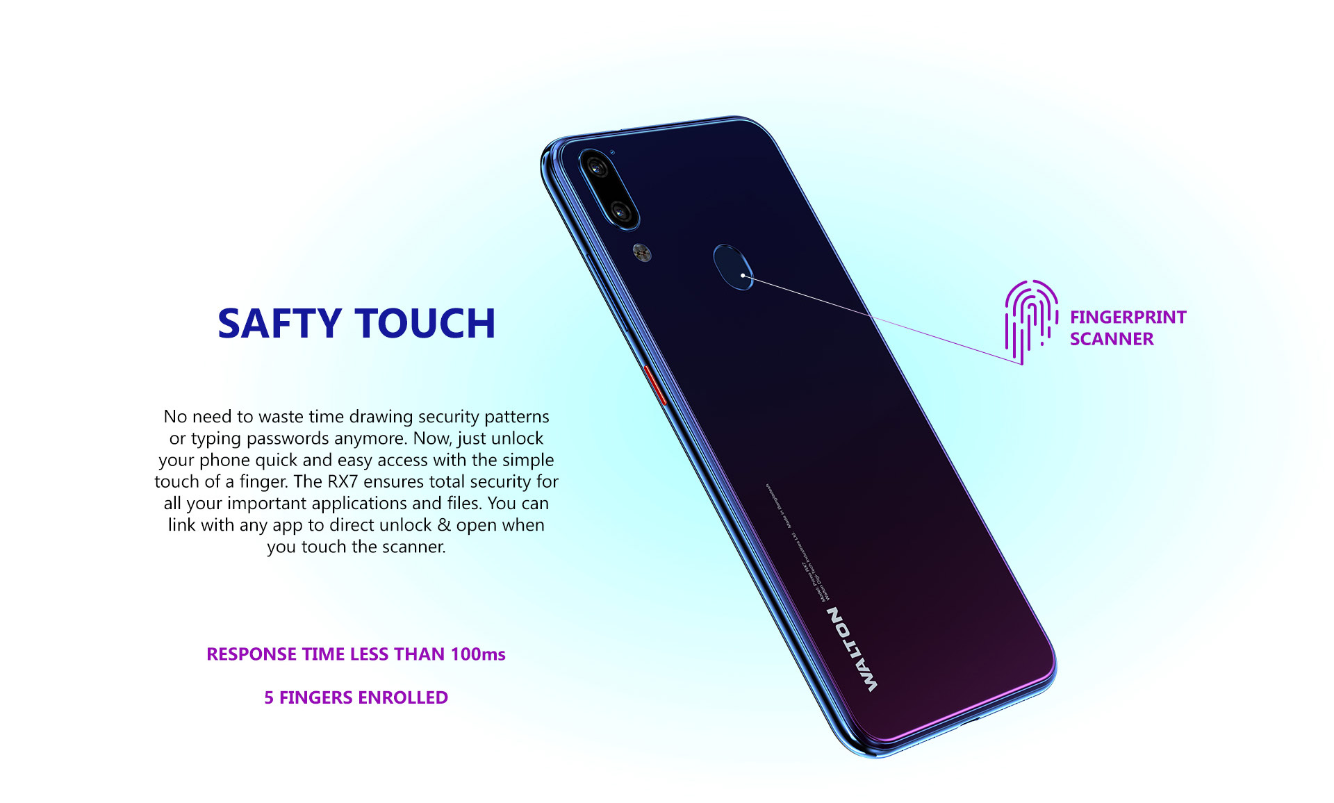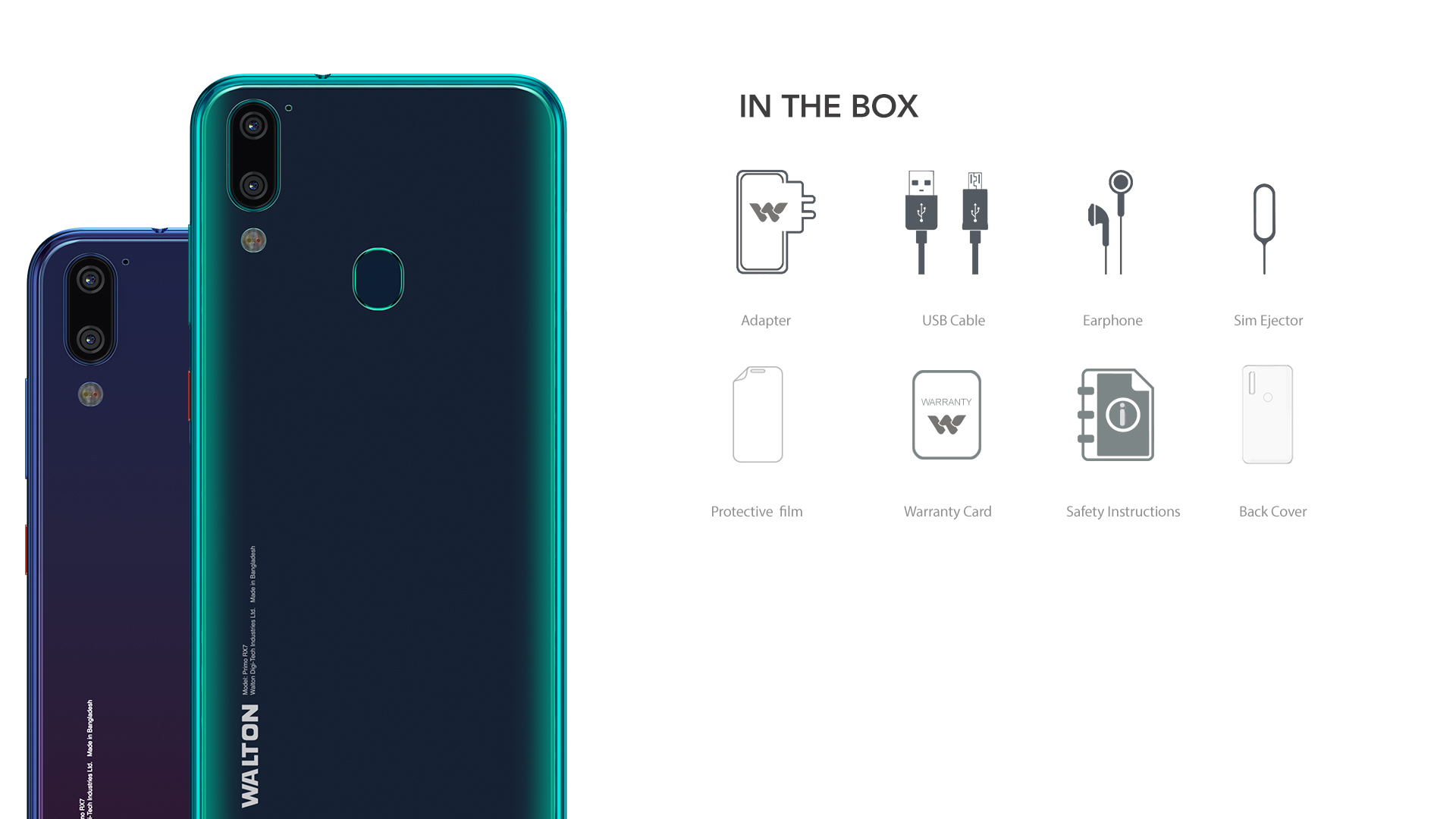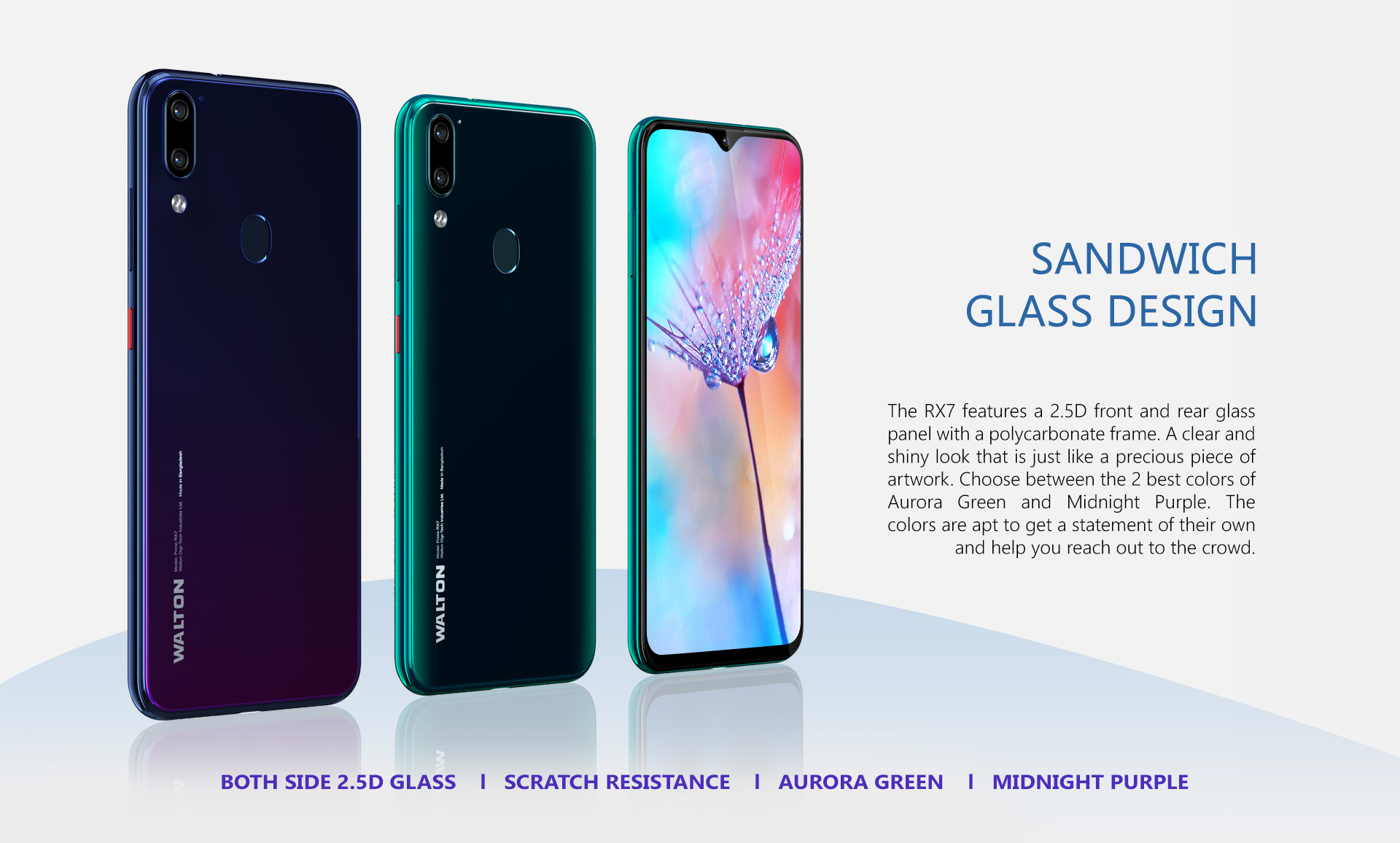 Primo RX7 ডিভাইসটি আসছে স্যান্ডউইচ গ্লাস ডিজাইন এর সাথে। অর্থাৎ স্ক্রিনের ফ্রন্ট প্যানেলে তো গ্লাস পাচ্ছেনই, পিছে তথা রিয়ার প্যানেলেও পাবেন গ্লাস ব্যাক। আর উভয়পাশে এই গ্লাস স্ক্র্যাচ প্রটেক্টিভও বটে। Primo RX7 এর ডিজাইন অনেকটা হুয়াওয়ে ধাঁচের। এর ফ্রন্ট সাইড দেখলে মনে হবে হুয়াওয়ে ওয়াই৬ ২০১৯ এর মত আর পিছনটা পুরোটা হুয়াওয়ে পি২০ প্রো এর মত। সুতরাং ডিজাইন এর দিক দিয়ে ওয়ালটন এই ডিভাইসে ‘নো কম্প্রোমাইজ’ রুল ফলো করেছে। বাজারে ফোনটি পাওয়া যাবে দারুন দুটি কালারে, এগুলো হলোঃ অরোরা গ্রিন এবং মিডনাইট পারপেল, এবং কোন কালারই কোনটির থেকে কম নয়। তবে মিডনাইট পারপেল এর আগের প্রায় সব গ্র্যাডিয়েন্ট কালার সম্বলিত ফোনে দেখা গিয়েছে, সেই হিসেবে অরোরা গ্রিন কালারটি নতুন।