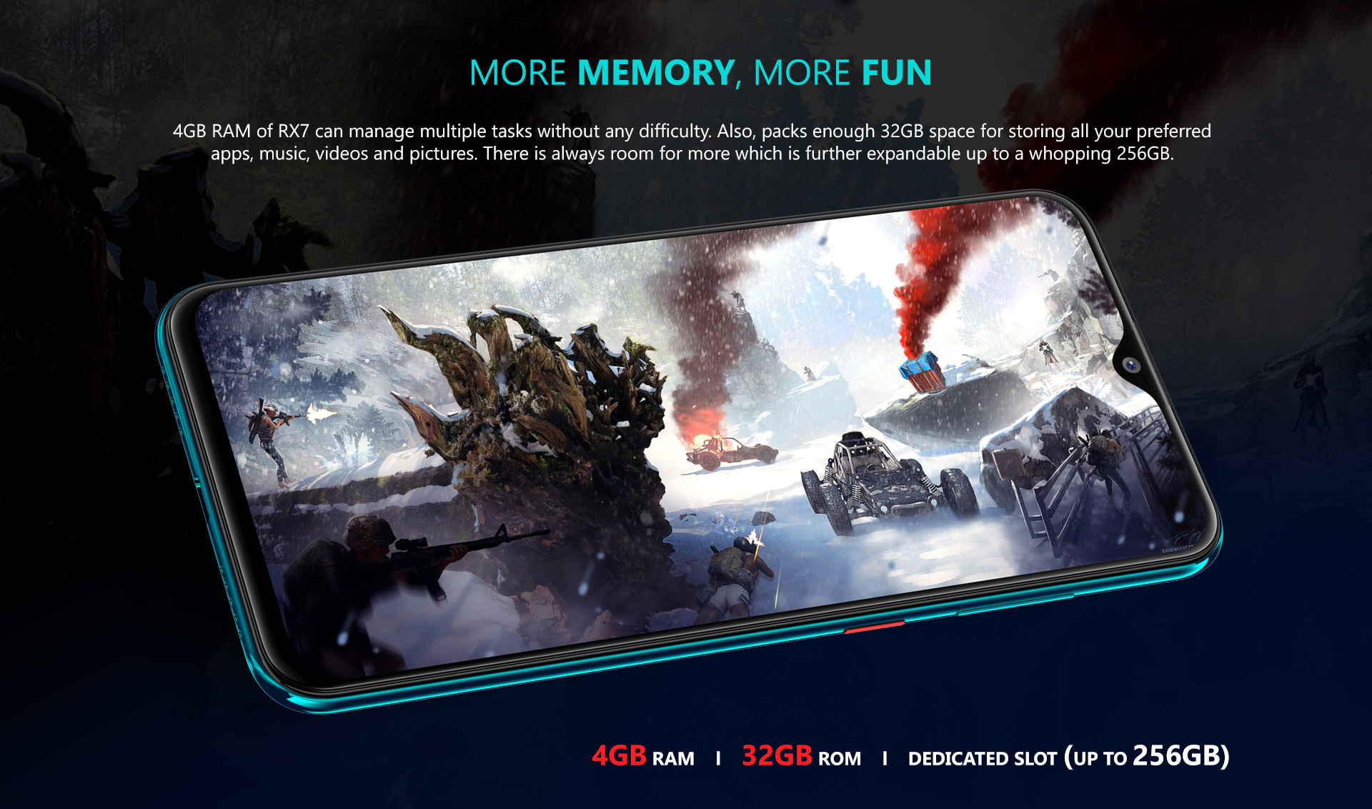 এতে পাওয়া যাবে ৪ জিবি র্যাম। সুতরাং হালের জনপ্রিয় যত গেমস গুলো আছে, যেমনঃ কল অফ ডিউটি, ফিফা১৯, এস্পল্ট৯, পাবজি ইত্যাদি গেমস এই ফোনে খেলা যাবে একদম অনায়াসে। তাছাড়া ৪ জিবি র্যাম মাল্টি টাস্কিং এর জন্য প্লাস পয়েন্ট তো থাকছেই। ৩২ জিবি ইন্টারনাল রমের পাশাপাশি এতে পাওয়া যাবে একটি ডেডিকেটেড এসডি কার্ড স্লট, যেখানে আপনি ২৫৬ জিবি পর্যন্ত এসডি কার্ড ব্যবহার করতে পারবেন। ৩২ জিবি রমের ভেতর এতে ইউজারএর জন্য ২৪ জিবি স্টোরেজ ফাকা পাওয়া যাবে।