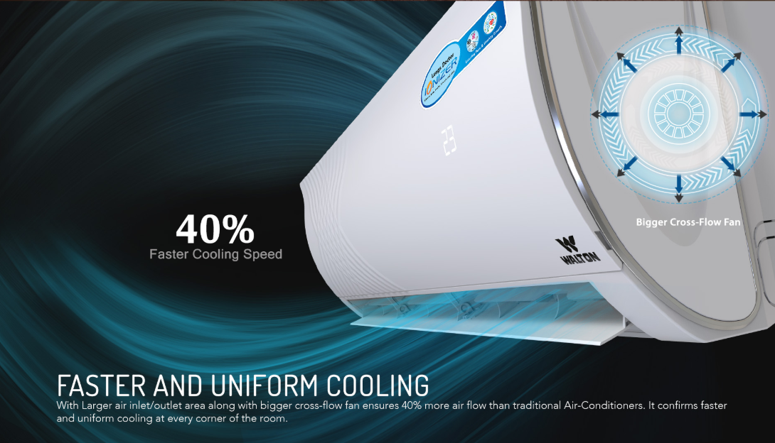 ঘর কতোটা এবং কত দ্রুত ঠাণ্ডা হবে তা নির্ভর করে এসির ভিতর থাকা ফ্যান এর উপর। এই ফ্যান যত বেশি বড় হবে, এর ফলে এসিকে তত বেশি কার্যকর বলা যাবে। এই এসিটিতে থাকছে তুলনামূলক বড় ক্রস ব্লো ফ্যান। আর এর ফলে বাজারের অন্য সব এসির চাইতে এই এসিটির কুলিং স্পিড হবে ৪০% বেশি। আর এই ক্রস ব্লো ফ্যানটি অতো বেশি নয়েসি নয়, খুবই সাইলেন্টলি এর কাজ করে যায়।