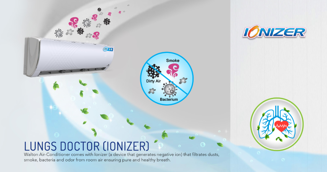 যদি আপনার ঘরের বাতাস একদম বিশুদ্ধ রাখার চিন্তা করে থাকেন তবে এই এসিটি আপনার জন্য। ক্রিস্টালাইন এর এই মডেল এর সাথে আপনি পাচ্ছেন বিশেষ আইওনাইজার প্রযুক্তি। আইওনাইজার প্রযুক্তির এসি আপনার ঘরের জন্য একটি শক্তিশালী এয়ার পিউরিফায়ার হিসেবে কাজ করে। এটি বাতাস থেকে ধূলিকণা, মাইক্রোঅরগ্যানিজমস ইত্যাদি দূর করে এবং বাতাসকে শতভাগ বিশুদ্ধ রাখার কাজ করে। এই এসি থেকে নেগেটিভ আয়ন বের হওয়ার কারণে এটি দূষিত বায়ু, ব্যাক্টেরিয়া, ধুলিকণা, ধোঁয়া সবকিছু একদম ঘরের বাইরে নিয়ে যায়।