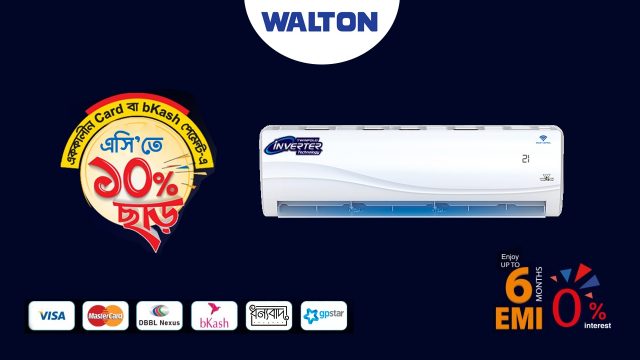 ডিজিটাল পেমেন্ট গেটওয়ে ব্যবহার করে এয়ার কন্ডিশনার তথা এসি কেনায় আকর্ষণীয় মূল্যছাড় দিচ্ছে দেশীয় ব্র্যান্ড ওয়ালটন। ওয়ালটন এয়ার কন্ডিশনার কিনে যেকোনো ব্যাংকের ডেবিট-ক্রেডিট কার্ড কিংবা বিকাশ ও রকেটে পেমেন্ট করলেই মিলবে ১০ শতাংশ ডিসকাউন্ট। ইএমআই সুবিধায় পণ্য কেনার ক্ষেত্রেও মূল্যছাড় উপভোগ করা যাবে। রবি ধন্যবাদ গ্রাহক এবং গ্রামীনফোনের স্টার গ্রাহকরাও এসি কেনার ক্ষেত্রে ১০% ছাড় পাবেন।