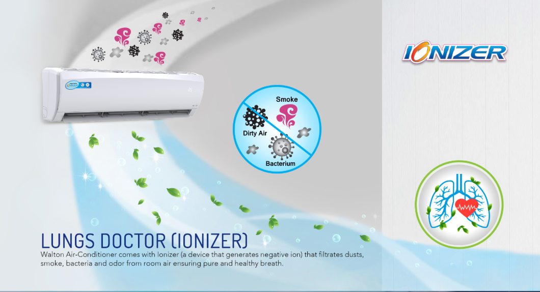যদি আপনার ঘরের বাতাস একদম বিশুদ্ধ রাখার চিন্তা করে থাকেন তবে এই এসিটি আপনার জন্য। ভেনচুরি এর এই মডেল এর সাথে আপনি পাচ্ছেন বিশেষ আইওনাইজার প্রযুক্তি। আইওনাইজার প্রযুক্তির এসি আপনার ঘরের জন্য একটি শক্তিশালী এয়ার পিউরিফায়ার হিসেবে কাজ করে। এটি বাতাস থেকে ধূলিকণা, মাইক্রোঅরগ্যানিজমস ইত্যাদি দূর করে এবং বাতাসকে শতভাগ বিশুদ্ধ রাখার কাজ করে। এই এসি থেকে নেগেটিভ আয়ন বের হওয়ার কারণে এটি দূষিত বায়ু, ব্যাক্টেরিয়া, ধুলোকনা, ধোয়া সবকিছু একদম ঘরের বাইরে নিয়ে যায়।