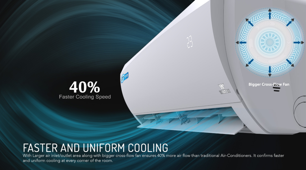 ঘর কতোটা এবং কত দ্রুত ঠাণ্ডা হবে তা নির্ভর করে এসির ভেতর থাকা ফ্যানের ওপর। এই ফ্যান যত বেশি বড় হবে, এই এসিকে এর ফলে তত বেশি কার্যকর বলা যাবে। এই এসিটিতে থাকছে তুলনামূলক বড় ক্রস ব্লো ফ্যান। আর এর ফলে বাজারের অন্য সব এসির চাইতে এই এসিটির কুলিং স্পিড হবে ৪০% বেশি। আর এই ক্রস ব্লো ফ্যানটি অতো বেশি নয়েসি নয়, খুবই সাইলেন্টলি এর কাজ করে যায়।