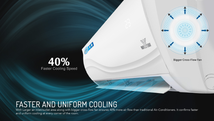 ঘর কতোটা এবং কত দ্রুত ঠাণ্ডা হবে তা নির্ভর করে এসির ভেতর থাকা ফ্যানের ওপর। এই ফ্যান যত বেশি বড় হবে, এই এসিকে এর ফলে তত বেশি কার্যকর বলা যাবে। এই এসিটিতে থাকছে তুলনামূলক বড় ক্রস ব্লো ফ্যান। আর এর ফলে বাজারের অন্য সব এসির চাইতে এই এসিটির কুলিং স্পিড হবে ৪০% বেশি। আর এই ক্রস ব্লো ফ্যানটি অতো বেশি নয়েসি নয়, খুবই সাইলেন্টলি এর কাজ করে যায়।