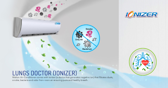 যদি আপনার ঘরের বাতাস একদম বিশুদ্ধ রাখার চিন্তা করে থাকেন তবে এই এসিটি আপনার জন্য। ক্রিস্টালাইন এর এই মডেল এর সাথে আপনি পাচ্ছেন বিশেষ আইওনাইজার প্রযুক্তি। আইওনাইজার প্রযুক্তির এসি আপনার ঘরের জন্য একটি শক্তিশালী এয়ার পিউরিফায়ার হিসেবে কাজ করে। এটি বাতাস থেকে ধূলিকণা, মাইক্রোঅরগ্যানিজমস ইত্যাদি দূর করে এবং বাতাসকে শতভাগ বিশুদ্ধ রাখার কাজ করে। এই এসি থেকে নেগেটিভ আয়ন বের হওয়ার কারনে এটি দূষিত বায়ু, ব্যক্টেরিয়া, ধুলোকনা, ধোয়া সবকিছু একদম ঘরের বাইরে নিয়ে যায়।