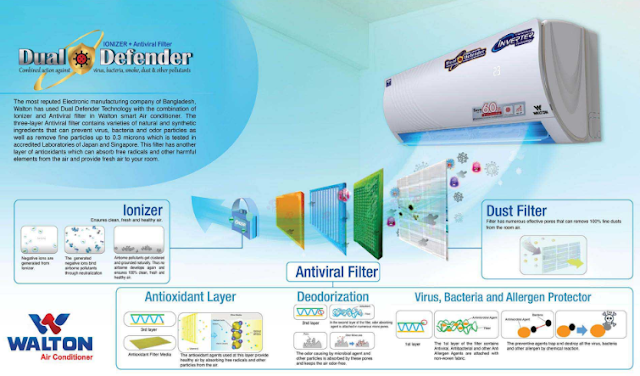 সম্প্রতি ওয়ালটন তাদের ক্রিস্টালাইন সিরিজের অধীনে আরেকটি নতুন এসি নিয়ে এসেছে। আর এটি এই সিরিজের অধীনে একটি ১.৫ টন ক্যাপাসিটির এসি, অর্থাৎ ১৮০০০ বিটিইউ। ওয়ালটন এই টুইনফোল্ড ইনভার্টার এসিতে বাতাসের বিশুদ্ধতা রক্ষা, বাতাসকে সকল প্রকার ক্ষতিকর উপাদান থেকে রক্ষার ব্যাপারে দারুনভাবে কজ করেছে। কেননা এই এসিটির অন্যতম একটি প্রমিসিং ফিচার এর ‘ডুয়াল ডিফেন্ডার’ তথা স্মার্ট ডিফেন্ডার প্রযুক্তি।