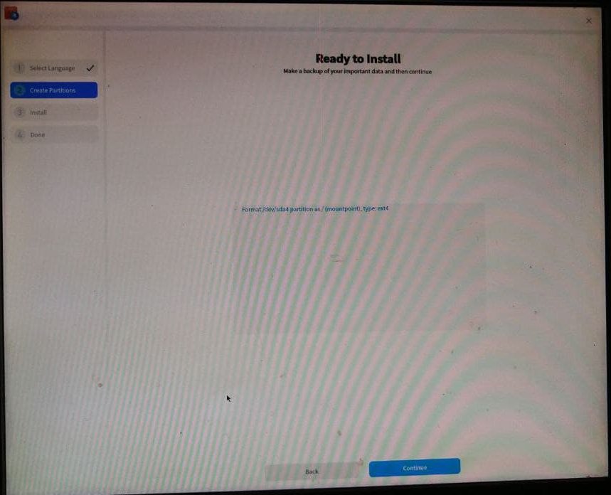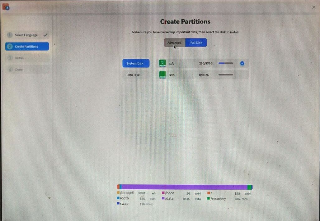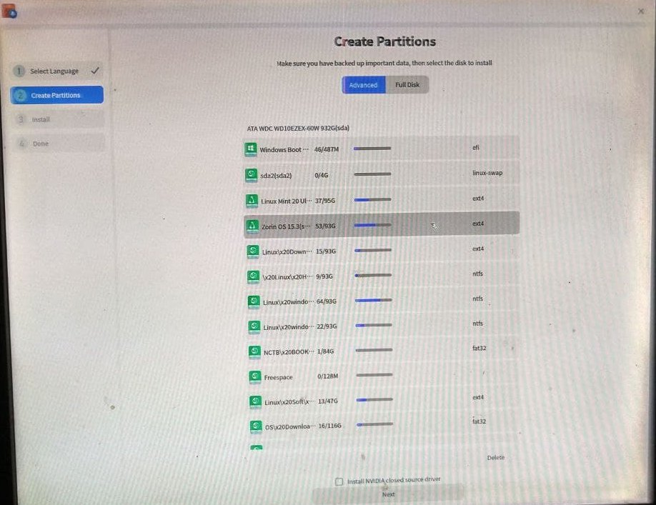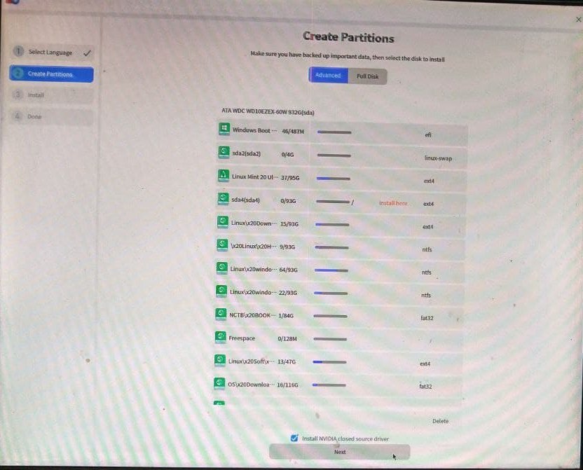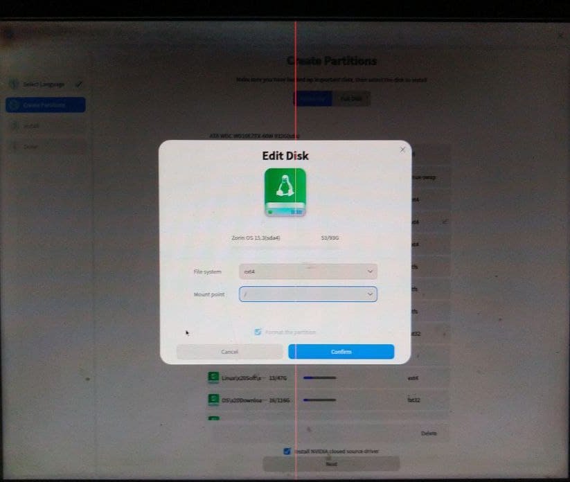এই অপশন এ এসে পার্টিশন তৈরি করে নিতে হবে। চিত্রে দেখা যাচ্ছে sda এবং sdb দুটি হার্ডডিস্ক। আপনাদের হার্ডডিস্ক যে কয়টি থাকবে এখানে সেটি দেখাবে। আমার দুটো হার্ডডিস্ক লাগানো আছে তাই এখানে দুটো দেখাচ্ছে। অবশ্যই মনে রাখতে কোন হার্ডডিস্কে লিনাক্স ইনষ্টল দিবেন। যদি আপনার আগে থেকেই লিনাক্স মিন্ট বা উবুন্টু বা অন্য কোনো ডিস্ট্রো ইনষ্টল দেওয়া থাকে। এখন কি ইনষ্টল দেওয়া লিনাক্সের উপর নতুন করে ইনস্টল দিয়ে ডুয়েল বুট করবেন অথবা ফ্রিস্পেস থেকে পার্টিশন তৈরি করে নিয়ে ইনষ্টল দিবেন সেটা আপনাদের পছন্দ। আমি আমার জরিন ওএস লিনাক্স ইনষ্টল দেওয়া পার্টিশনেই ডিপিন লিনাক্স ইনষ্টল দিবো। চিত্রে তা দেখিয়ে দিচ্ছি। আমার যেহেতু কোনো গুরুত্বপূর্ণ ফাইল নেই তাই টেষ্ট করার জন্য ডিপিন ওএস ইনষ্টল দেওয়া। তাহলে আসুন পরবর্তি পদক্ষেপে যাওয়া যাক।