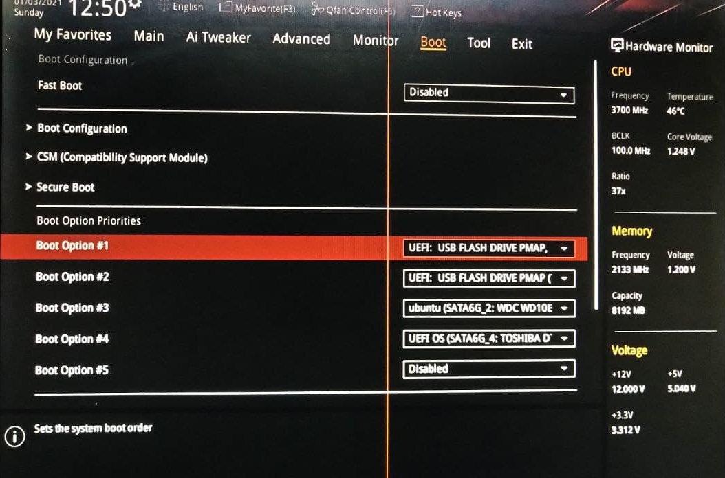 বুট টেব এ ক্লিক করার পর Boot Option Priorities >সেট করুন প্রথমে পেনড্রাইভ, তারপর হার্ডডিস্ক। এখানে আমার পিসিতে দুইটা হার্ডডিস্ক লাগানো আছে সেটা দেখাচ্ছে। একটাতে লিনাক্স আর একটা হ্যাকিন্টোষ।