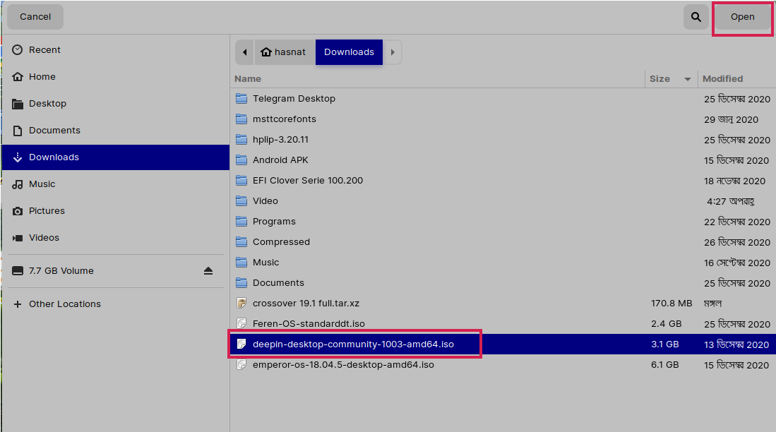 যেখানে ডাউনলোড করছেন সেই ফোল্ডারে যান। আমি আমার ডাউনলোড ফোল্ডারে ডিপিন ডাউনলোড করেছি। যেই ফোল্ডারেই ডাউনলোড করুন না কেনো সেখানে গিয়ে সিলেক্ট করুন deepin iso ফাইল। তারপর অপেন এ ক্লিক করুন।