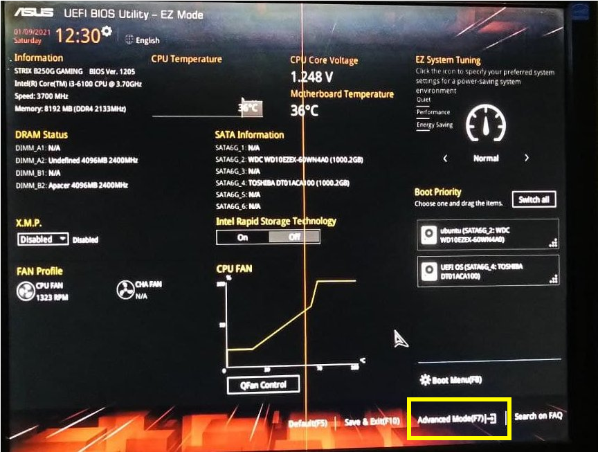 পিসি রিস্টার্ট দিন। কিবোর্ড থেকে F2 অথবা Delete কি চেপে রাখুন বায়োসে প্রবেশ করার জন্য। বায়োসে ঢুকার পর বায়োসের নিচের দিকে Advanced Mode ক্লিক করুন।