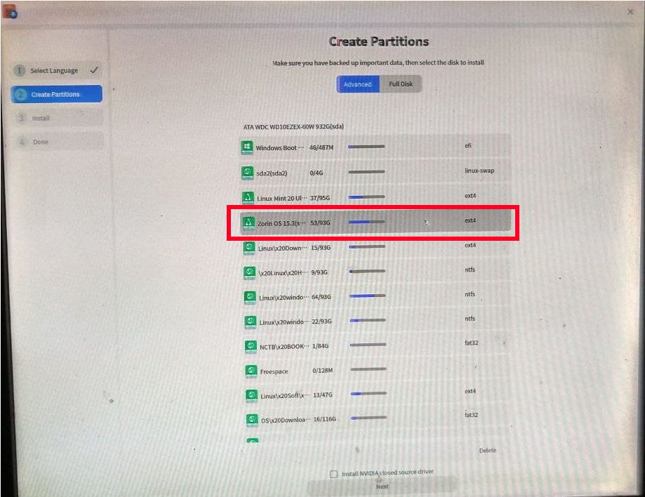 Advanced এ ক্লিক করার পর যে উইন্ডো আসবে সেখানে আমি আমার Zorin OS 15.3 সিলেক্ট করে, install NVIDIA driver চেক বক্সে টিক চিহ্ন দিয়ে নেক্সট ক্লিক করলাম।