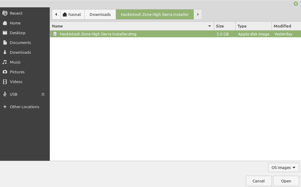 সেই ফোল্ডারে গিয়ে সিলেক্ট করুন Hackintosh Zone High Sierra Installer.dmg। তারপর অপেন এ ক্লিক করুন।