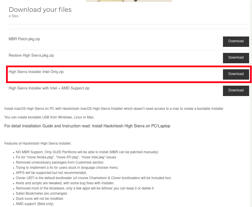 Agree & Download ক্লিক করার পর যে পেইজ আসবে সেখানে ডাউনলোড এর ৪টা পার্ট দেখতে পাবেন। ডাউনলোড করার জন্য High Sierra Installer Intel Only.zip লেখা ডাউনলোড করে নিন।