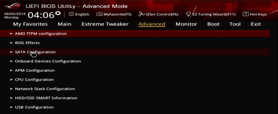 বায়োস মেনুতে ক্লিক Advanced টেব তারপর ক্লিক SATA Configuration