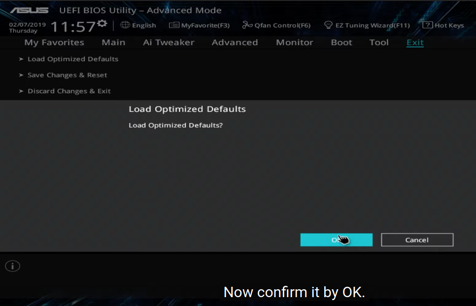 বায়োস স্ক্রিনের টপরাইট কর্নারে Exit টেব ক্লিক করুন। তারপর ক্লিক করুন Load Optimized Defaults এটা খুবই গুরুত্বপূর্ণ তাই যাতে মিস না হয়।