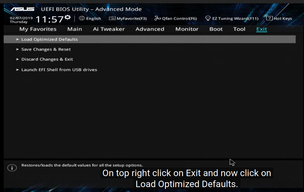 প্রথমে যে কাজটি করতে হবে উপরে কর্ণারে ডানদিকে Exit Tab এ ক্লিক তারপর ক্লিক Load Optimized Defaults.এটা অবশ্যই করে নিতে হবে বাদ দেওয়া যাবে না।
