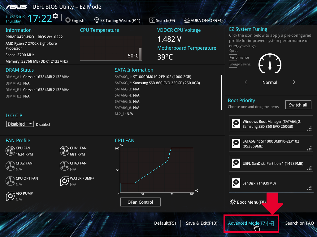 মাদারবোর্ড এর বায়োসে প্রবেশ করার জন্য পিসি স্টার্ট হওয়ার সময় কিবোর্ডে F2 অথবা delete কি চাপুন। বায়োসের ওয়েলকাম স্ক্রিন আসলে নিচের দিকে ডানে আপনি Advaned Mode (F7) সিলেক্ট করুন। Advanced Mode এ বায়োসের কিছু পরিবর্তন করে হ্যাকিন্টোষ উপযোগি করে সেট করে নিবো।