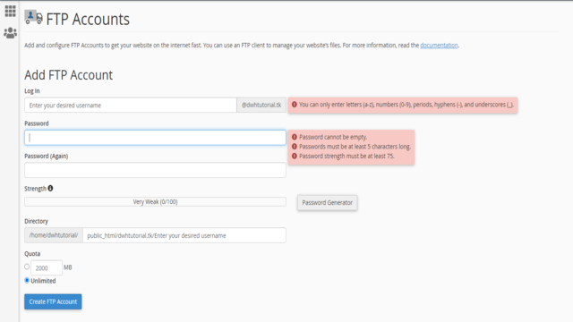 ৪। এফটিপি একাউন্টের জন্য কতটুকু স্পেস নির্ধারণ করতে চান তা ঠিক করে Quota ফিল্ড পূরণ করুন।