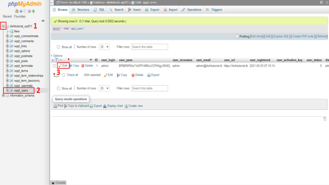 যেমনঃ প্রথমে ডাটাবেইজের নামের পাশে + আইকনে ক্লিক করুন। এরপর wp_users এ ক্লিক করুন। তারপর Edit এ ক্লিক করুন। দুই নাম্বার অপশনে wp এর পরিবর্তে অন্য নামও থাকতে পারে।