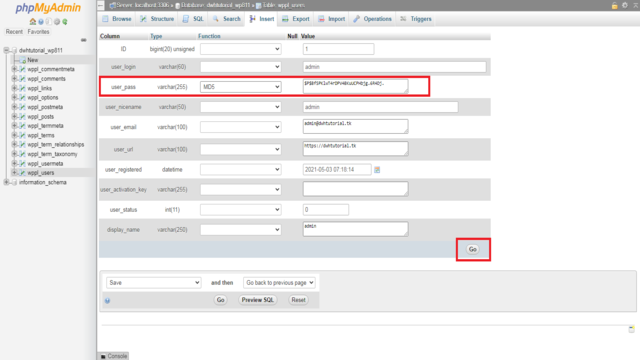 ৪। এখানে user_pass থেকে আপনার এডমিনের পাসওয়ার্ড পরিবর্তন করতে হবে। এর জন্য পাশে থেকে ড্রপ ডাউন অপশনগুলো থেকে MD5 সিলেক্ট করুন এবং পাশে থাকা ঘর থেকে পূর্ববর্তী এনকোডেড পাসওয়ার্ড মুছে আপনার নতুন পাসওয়ার্ড লিখুন এবং অবশ্যই স্ট্রং পাসওয়ার্ড ব্যবহার করার চেষ্টা করবেন। সব শেষে নিচে থেকে Go বাটনে ক্লিক করুন। ব্যাস, হয়ে গেলে আপনার কাজ।