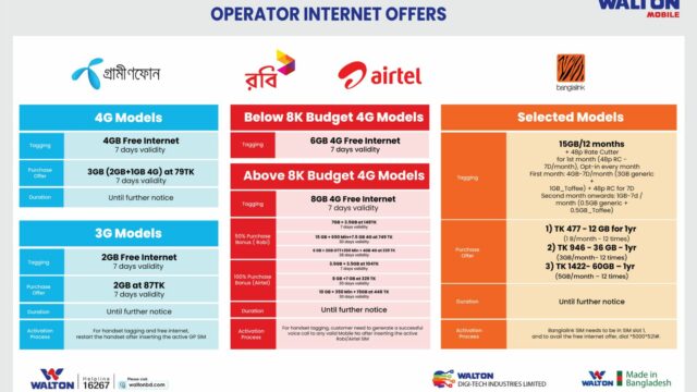 ৮ হাজার টাকার ভেতরে ওয়ালটনের যেকোনো নতুন ৪জি মডেলের স্মার্টফোন কিনলে ৭ দিনের জন্য রবি কিংবা এয়ারটেলে পেয়ে যাবেন ৬ জিবি ফ্রি ডাটা। একইভাবে ৮হাজার টাকার বেশি দামের যেকোনো ৪জি স্মার্টফোন কিনলে ৭ দিনের জন্য পেয়ে যাবেন ফ্রি ৮ জিবি ডাটা।