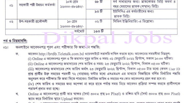 বাংলাদেশ পল্লী উন্নয়ন বাের্ডের অধীনে রাজস্ব বাজেটভুক্ত শূন্য পদে অস্থায়ী ভিত্তিতে বিধি মােতাবেক সরাসরি কোটায় জনবল নিয়ােগের জন্য নিম্নবর্ণিত সহকারী পল্লী উন্নয়ন কর্মকর্তা পদে বাংলাদেশ পল্লী উন্নয়ন বোর্ড এর সেরা সার্কুলার শর্ত সাপেক্ষে বাংলাদেশের প্রকৃত/স্থায়ী নাগরিকদের নিকট থেকে নিম্নোক্ত শর্তে http://brdb.Teletalk.com.bd ওয়েবসাইটে নির্ধারিত সময়ের মধ্যে অনলাইনে (online) আবেদন আহবান করা হচ্ছে। সহকারী পল্লী উন্নয়ন কর্মকর্তা পদের নিয়োগ বিজ্ঞপ্তিতে উল্লেখ আছে যে অনলাইন (online) ব্যতীত অন্য কোন মাধ্যমে প্রেরিত আবেদন গ্রহণ করা হবে না।