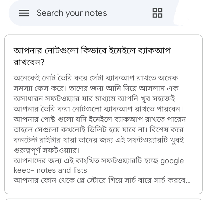 এরপর আপনাকে অতিরিক্ত আর কোন কাজ করতে হবে না। আপনি যতগুলো লিস্ট কিংবা নোট তৈরি করবেন তা অটোমেটিক আপনার মেইল একাউন্ট এ ব্যাকআপ হয়ে যাবে। এরপর আপনার ডিভাইস হারিয়ে গেলেও আর কোন সমস্যা হবে না। আপনি জাস্ট অন্য কোনো এক ডিভাইস থেকে Google keep notes এ প্রবেশ করবেন আর মেইল দিয়া লগিন করবেন। ব্যাস পেয়ে যাবেন আপনার আগের ব্যাকআপ করা নোটস কিংবা লিস্টস গুলো।